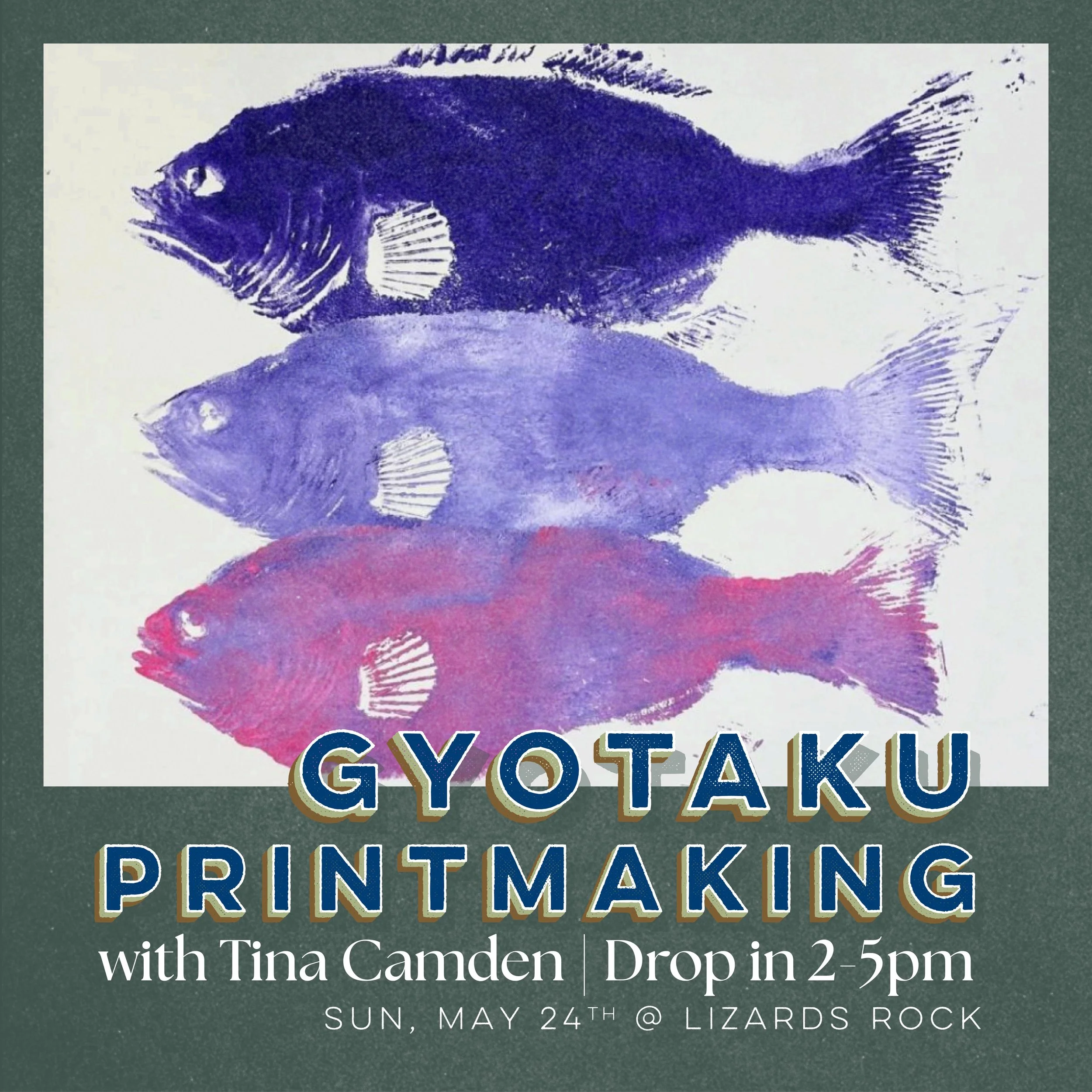 We're thrilled to welcome back FiddleHead Studios for our second collaborative art experience at Lizards Rock! Artist Tina Camden will be setting up her studio in the Lizards Rock pavilion to introduce you to Gyotaku — a fascinating Japanese art form dating back to the 1800s, when fishermen used it to document their prized catches.